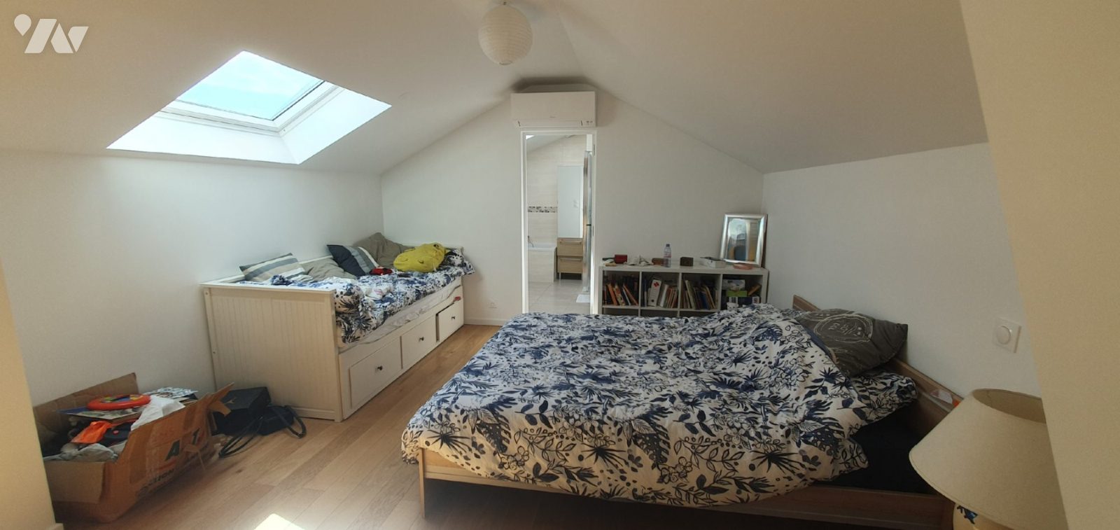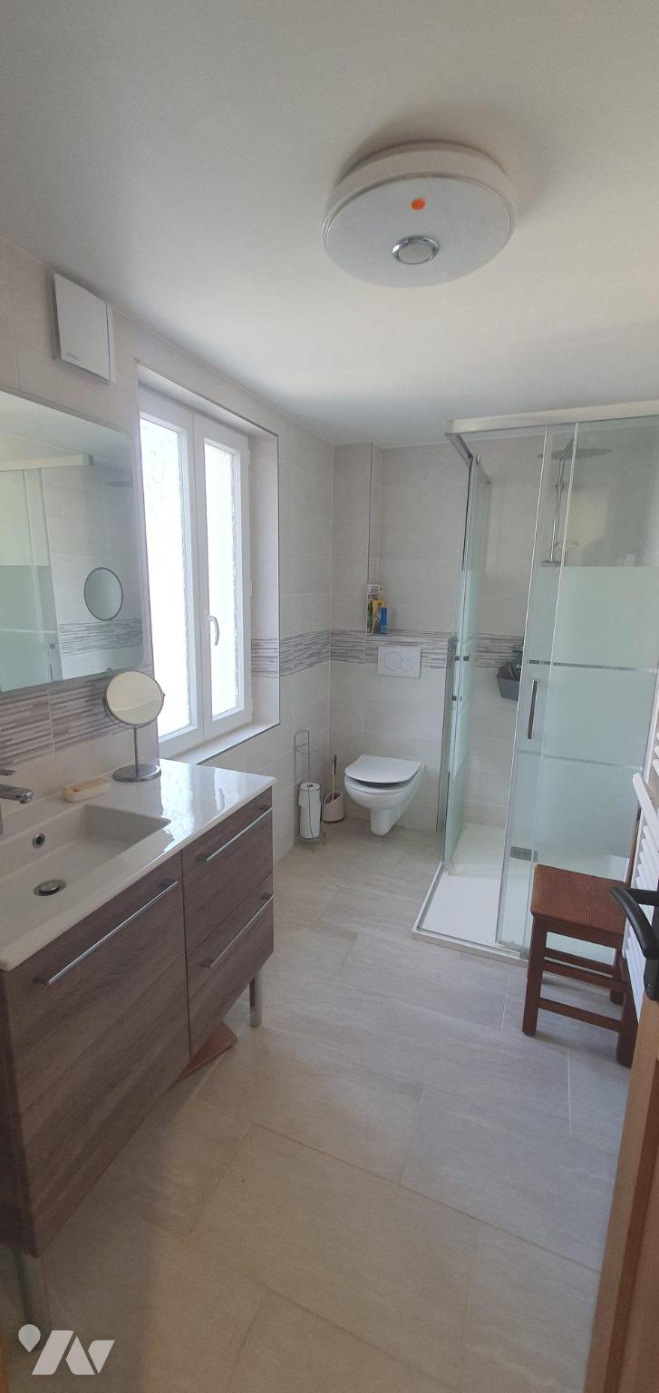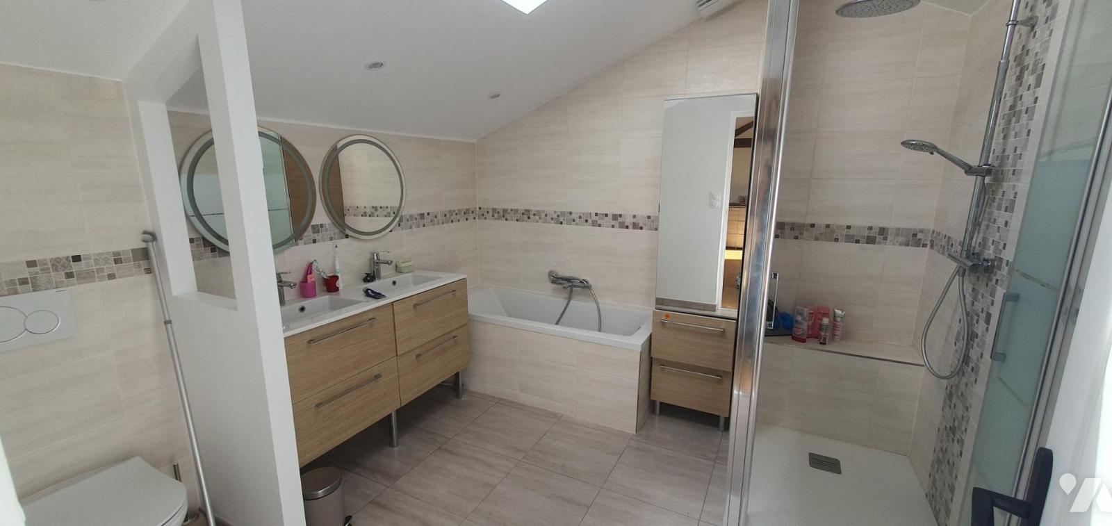 - A l'étage : un palier dessert 2 chambres de 13 et 17m² env. , WC suspendus avec lave-mains, une salle de bains avec douche, baignoire et dressing.